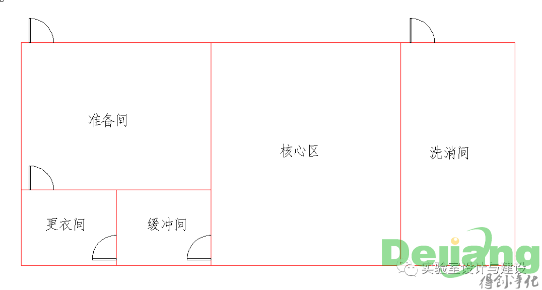 1、加强型P2实验室应包括缓冲间和核心工作间,缓冲间可兼顾防护类似于以下布局: